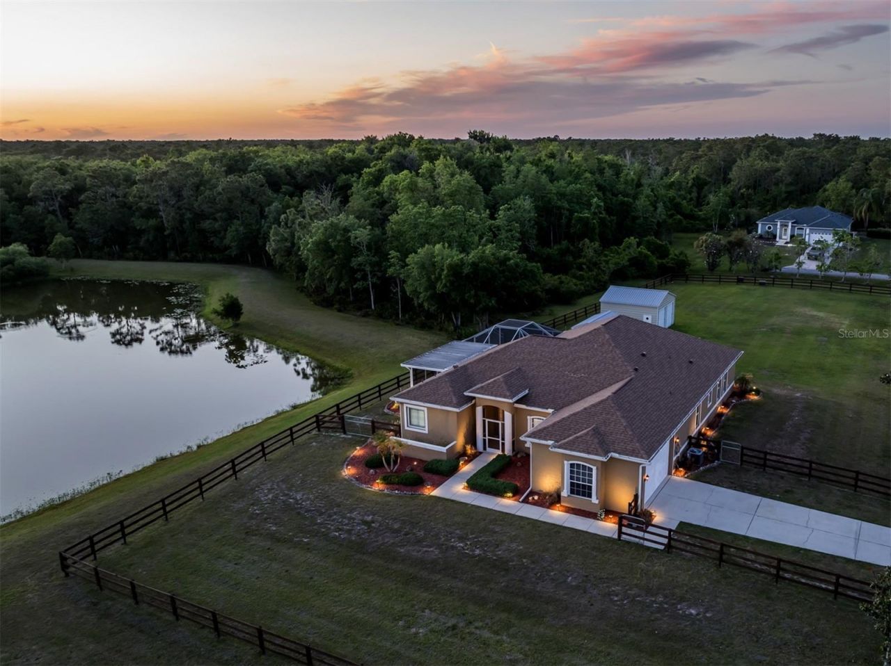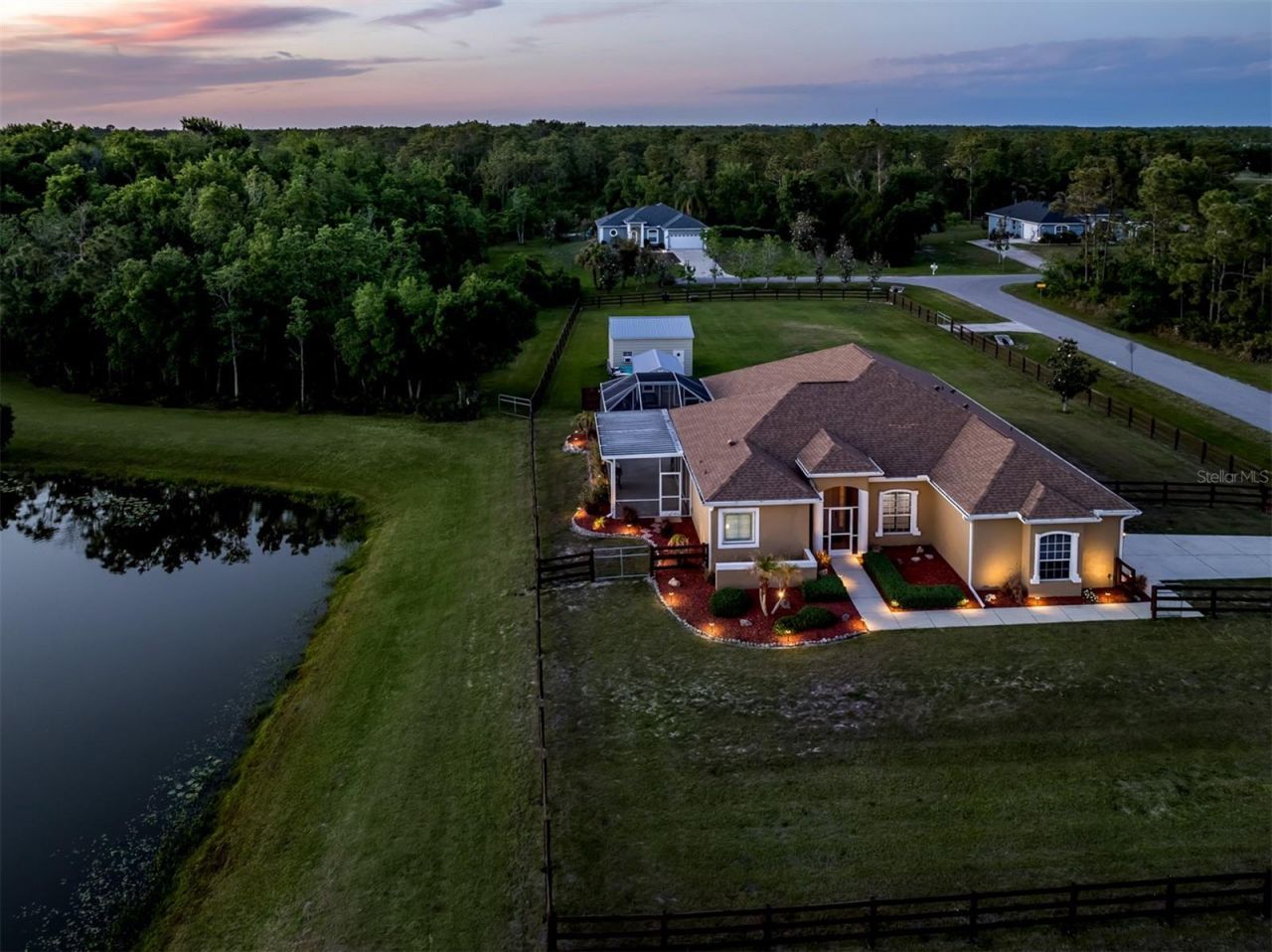 This beautifully updated home may be exactly what you've been searching for. Featuring 3 bedrooms, 3 bathrooms, and a desirable split floor plan with a versatile den/office (easily a potential 4th bedroom), the home offers both comfort and flexibility.Inside, you'll find wood flooring, designer paint, and upgraded appliances, along with a spacious kitchen that opens to the family room-perfect for everyday living and entertaining. The kitchen is enhanced with granite countertops, upgraded cherry wood cabinetry, and thoughtful design touches throughout.The primary suite is a true retreat, offering serene pond views, a large bedroom layout, and a luxurious en-suite bath with dual sinks and a relaxing garden tub.Step outside to enjoy tranquil lake views from the extended and enclosed screened porch, complete with a 6-person jetted spa-ideal for relaxing evenings. The oversized lot is fully fenced for privacy and includes two separate workshop sheds (12x12 and 20x20), perfect for hobbies, storage, or workspace needs.Additional highlights include:New roof (2023)Attached two-car garage with side-load designExpansive covered lanaiNo rear neighbors-just peaceful natural surroundings and wildlife.Situated on one of the best lots in the subdivision, this home offers a rare combination of privacy, water views, and modern upgrades. Whether you're enjoying the scenery, fishing by the lake, or relaxing in your spa, this property delivers the country lifestyle with all the conveniences of a newer home.Don't miss this incredible opportunity!
